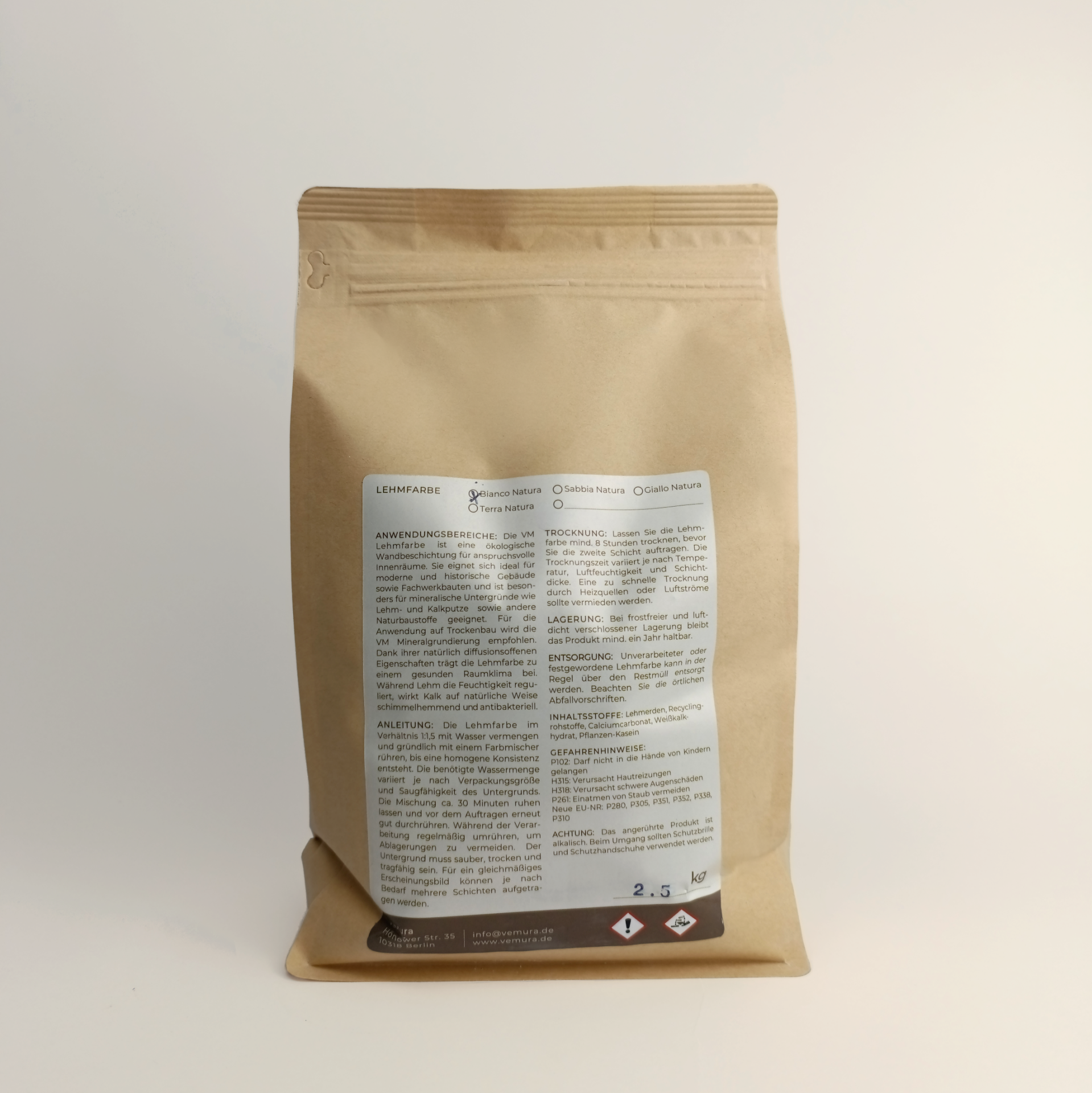 Die VM Lehmfarbe ist in den Farbtönen Bianco Natura, Lino Natura, Sabbia Natura, Giallo Natura und Terra Natura erhältlich. Die Nuancen können mit den VeMura Abtönfarben individuell eingefärbt werden. Detaillierte Informationen zur Farbtonanpassung sind im technischen Merkblatt zu finden.