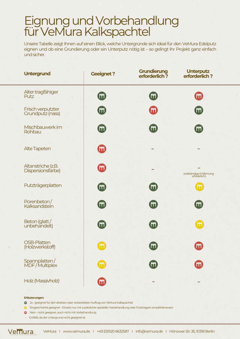 Für eine optimale Haftung empfehlen wir die Verwendung des VeMura Grundspachtels. Er reguliert das Saugverhalten des Untergrunds und sorgt für eine gleichmäßige Verarbeitung des Spachtels.